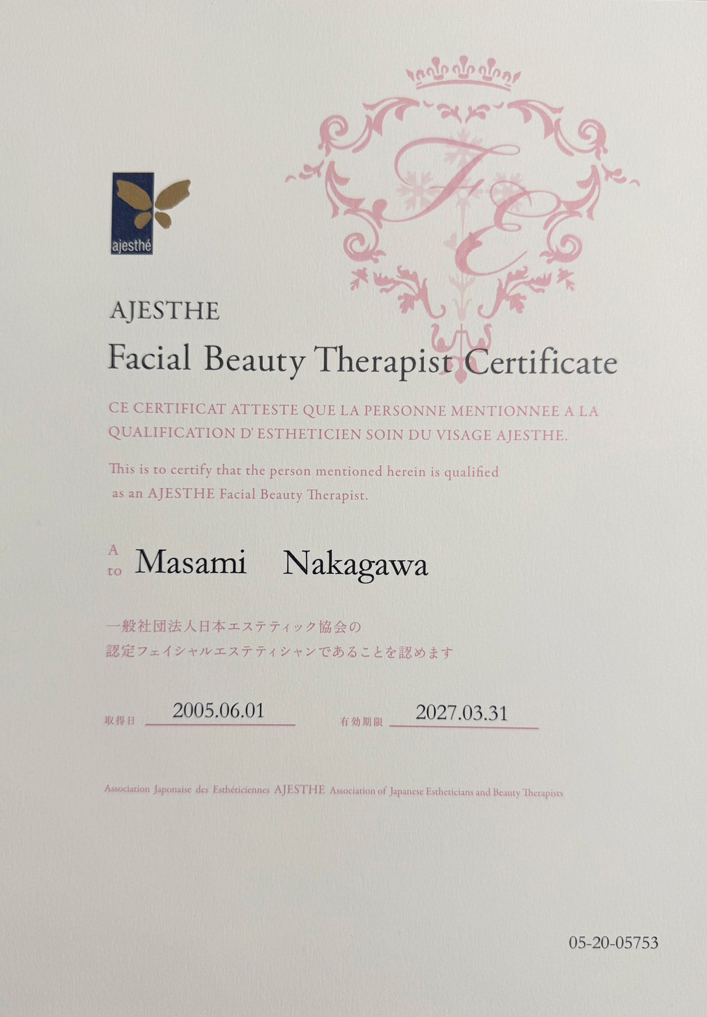 2005年6月:日本エステティック協会 認定フェイシャルエステティシャン取得